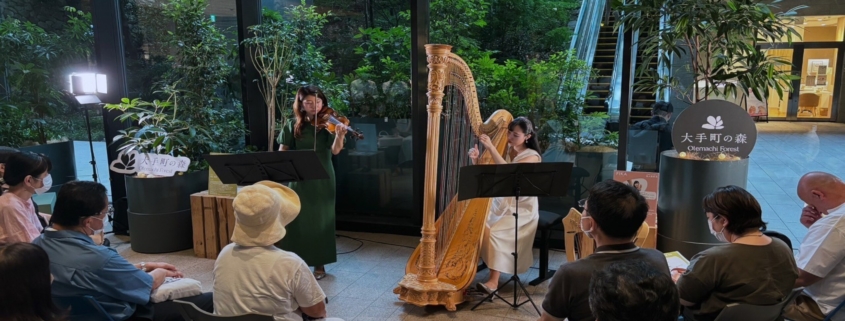 ハープとヴァイオリンが奏でる優しい音色に包まれながら、緑あふれる「大手町の森」でのひとときを楽しむ特別なひとときとなりました。