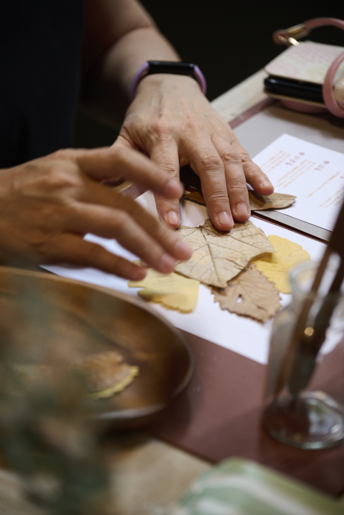 千葉県君津の森で採取した落ち葉を使い、色・形・模様をそのまま生かしたアートづくりをレクチャーいただきました。