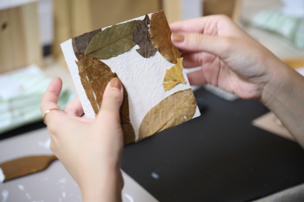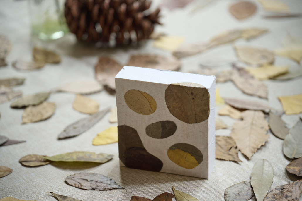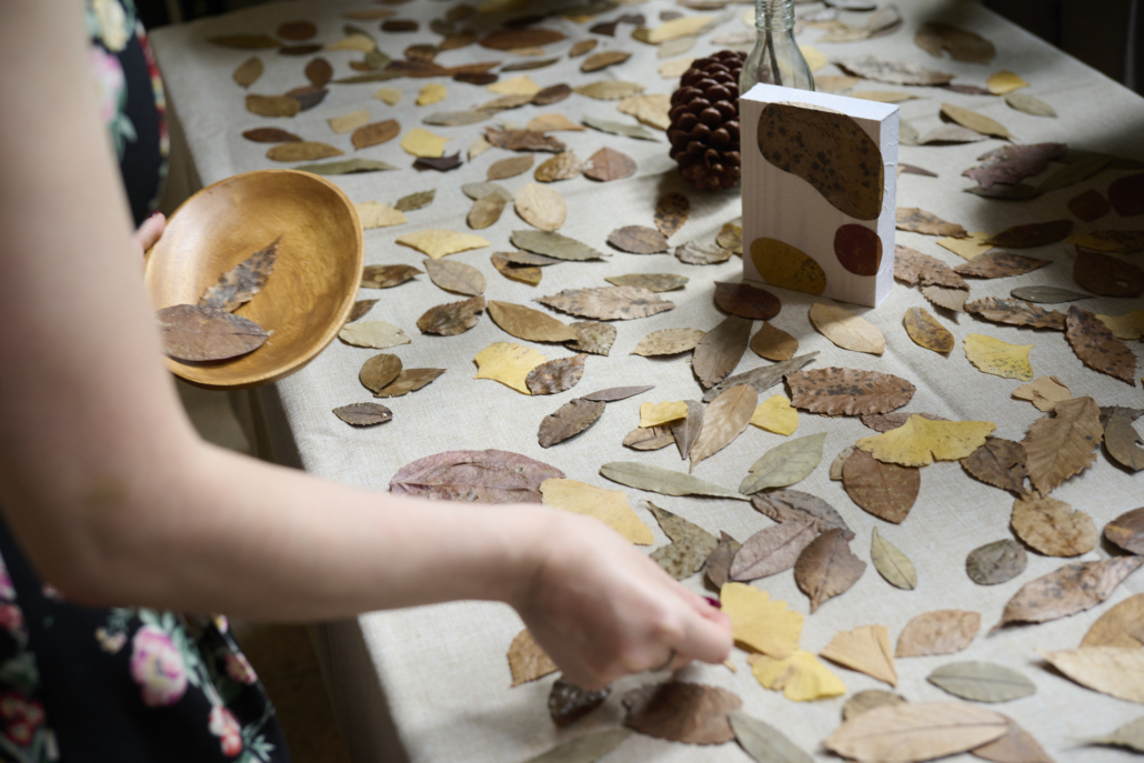 秋色に染まった森の落ち葉を素材にインテリアアートを制作するワークショップ。
