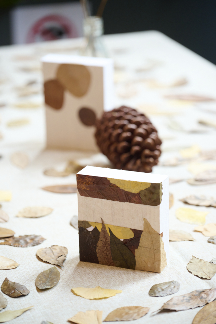 壁にかけたりデスクにおいて飾れるキャンバスボードで落ち葉のインテリアアートを作りませんか?