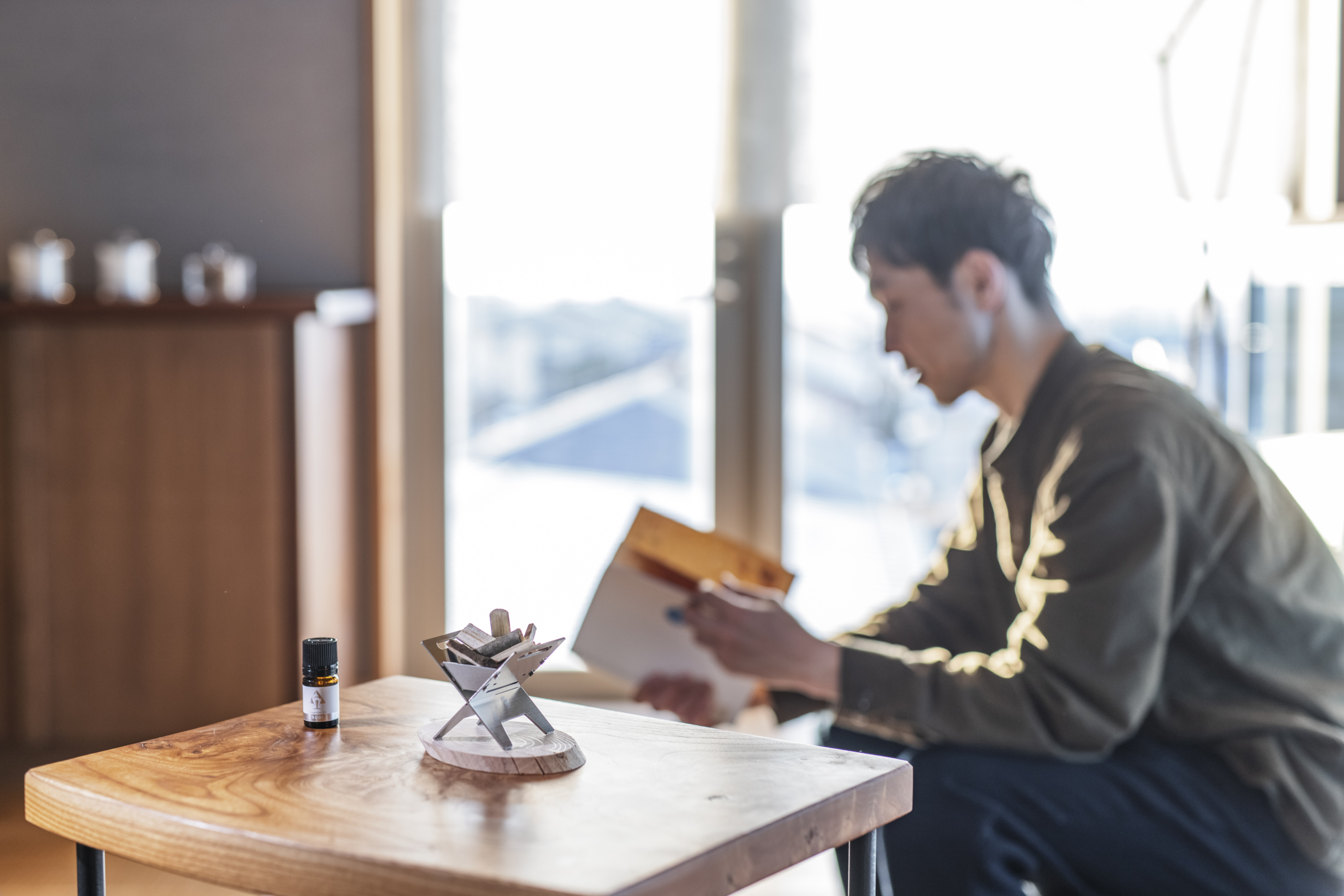 手入れの行き届かなくなった山に入り、間伐や整備を行いながら、森と向き合っています。そうした現場で出会う木々の香りや力強さをそのまま活かしたいという想いから、スギやクロモジなどの地元素材を用いたアロマ製品の製造を始めました。
