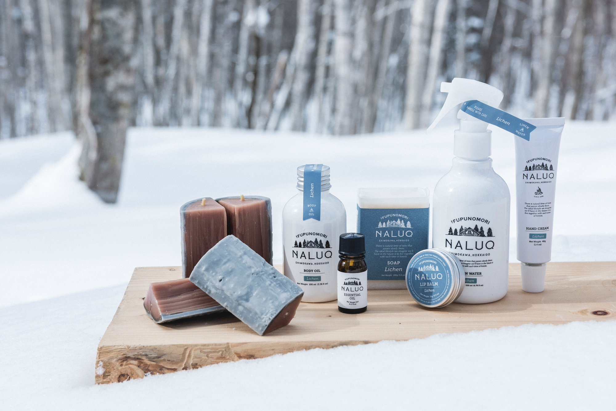 フプの森は、町内で伐った木の枝葉から、エッセンシャルオイルなどを抽出し、それらを使って二つのブランドを展開。北海道産、国産、オーガニック、など生産者が見える原料を厳選し、石油系界面活性剤、合成香料、合成防腐剤は不使用。大地にも体にも優しい暮らしを提案します。